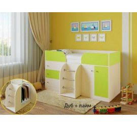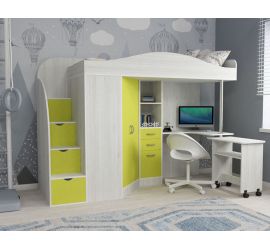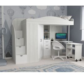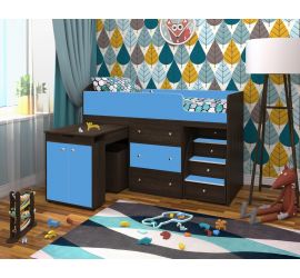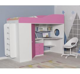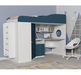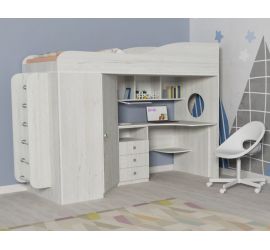 Второй вид кроватей-чердаков рассчитан на возраст детей от пяти лет. Спальное место в таком случае располагается на высоте 1,3-1,6 метра. На первом ярусе чаще всего есть шкаф и рабочая зона в формате письменного стола и книжных полок.