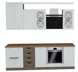 - Оптимальная компоновка: прямой гарнитур позволяет гармонично разместить кухонное оборудование и зону для приготовления пищи.